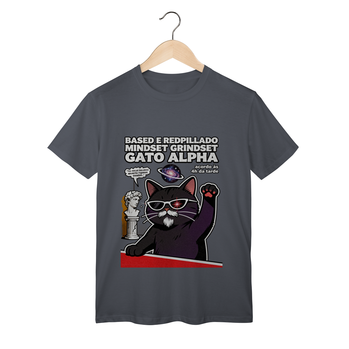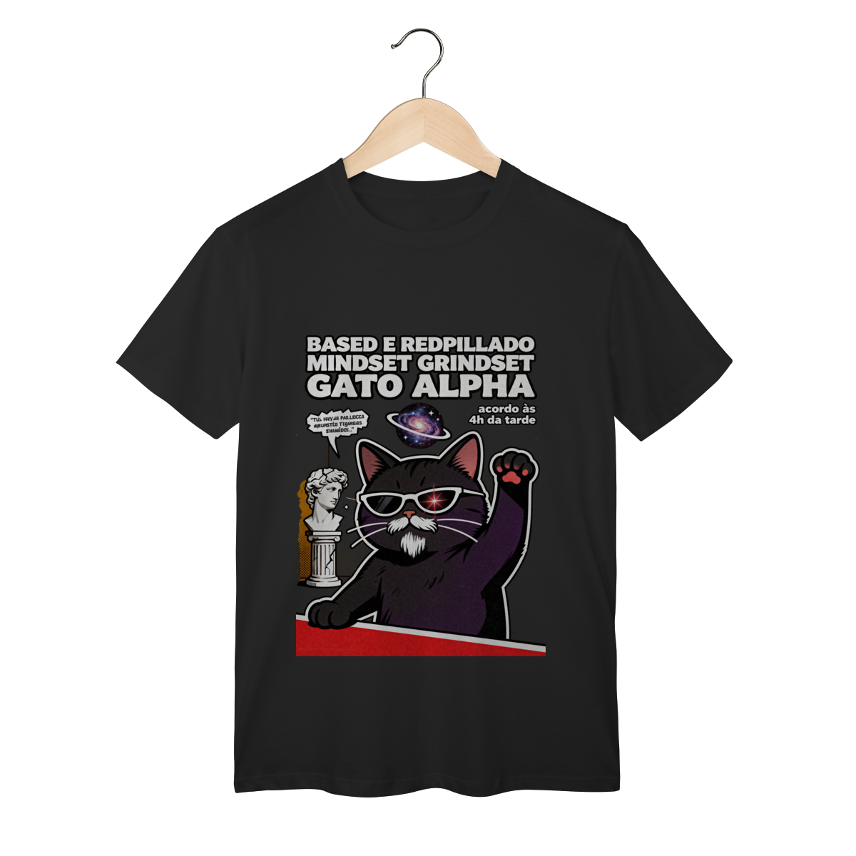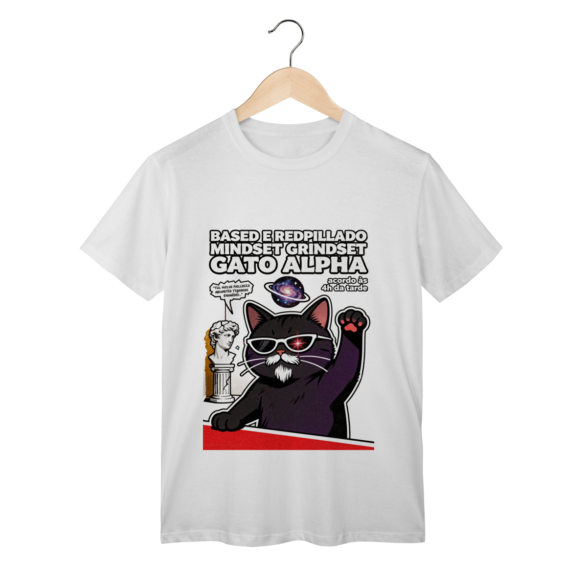 Based e redpillado, mindset grindset, gato alpha. Camiseta exclusiva Dicavalli com nosso gato tentando ser sério filosófico mas parecendo absolutamente ridículo. Óculos escuros à noite comportamento de gato indoor, pose sigma male mas goofy, cara séria mas bigodes tortos, barbinha falsa desenhada. Acordo às 4h da tarde. Design ironia Gen Z que satiriza cultura hustle e machos alpha. Arte original com galáxia cerebral meme, estética estátua grega quebrada silly, frases motivacionais nonsense, laser eyes mal feitos. Ideal para nerds, geeks e zoomers zoando masculinidade tóxica. Qualidade premium para ironia inteligente brasileira. Cringe proposital máximo.