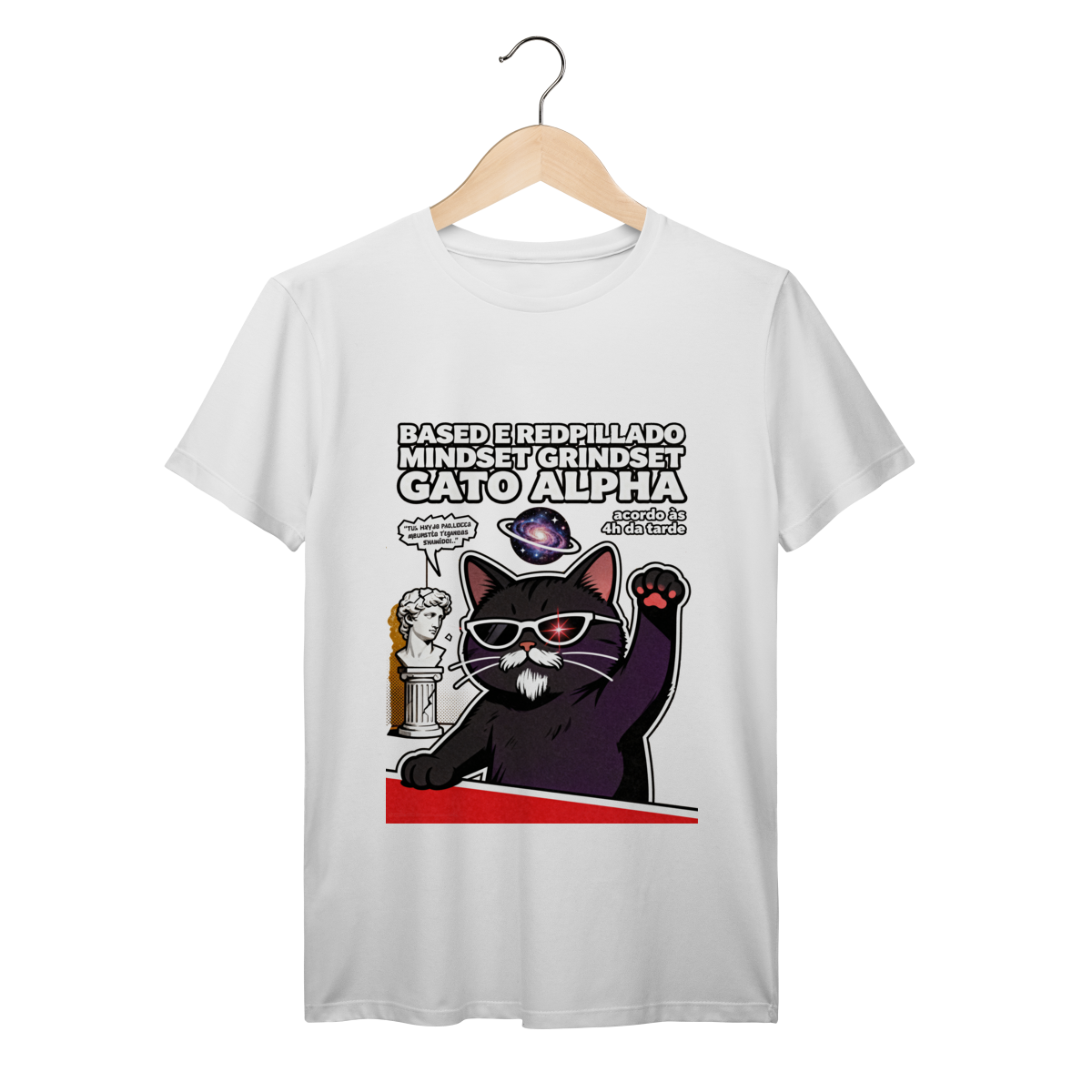 Based e redpillado, mindset grindset, gato alpha. Camiseta exclusiva Dicavalli com nosso gato tentando ser sério filosófico mas parecendo absolutamente ridículo. Óculos escuros à noite comportamento de gato indoor, pose sigma male mas goofy, cara séria mas bigodes tortos, barbinha falsa desenhada. Acordo às 4h da tarde. Design ironia Gen Z que satiriza cultura hustle e machos alpha. Arte original com galáxia cerebral meme, estética estátua grega quebrada silly, frases motivacionais nonsense, laser eyes mal feitos. Ideal para nerds, geeks e zoomers zoando masculinidade tóxica. Qualidade premium para ironia inteligente brasileira. Cringe proposital máximo.