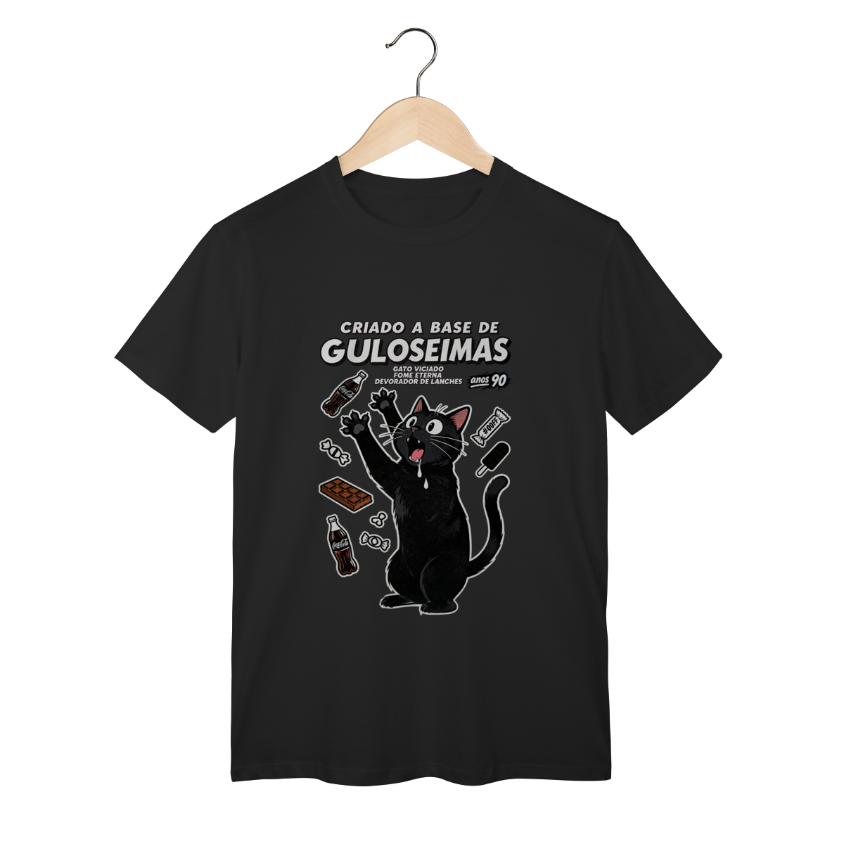 Criado a base de guloseimas e fome eterna insaciável. Camiseta exclusiva Dicavalli com nosso gato obsessivo em desespero cômico por snacks. Expressão de quem vê um salgadinho e perde totalmente o controle. Design horror-comédia retrô com estética de propaganda vintage anos 80/90 e vibe de vício alimentar hilário. Arte original que captura a relação tóxica mas deliciosa com guloseimas da infância. Ideal para nerds, geeks e devoradores compulsivos de lanches. Qualidade premium para quem foi criado literalmente a base de Fandangos, Bis e Guaraná. Fome eterna, humor eterno.