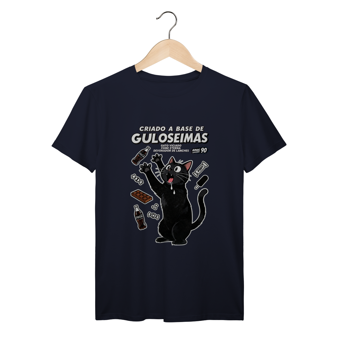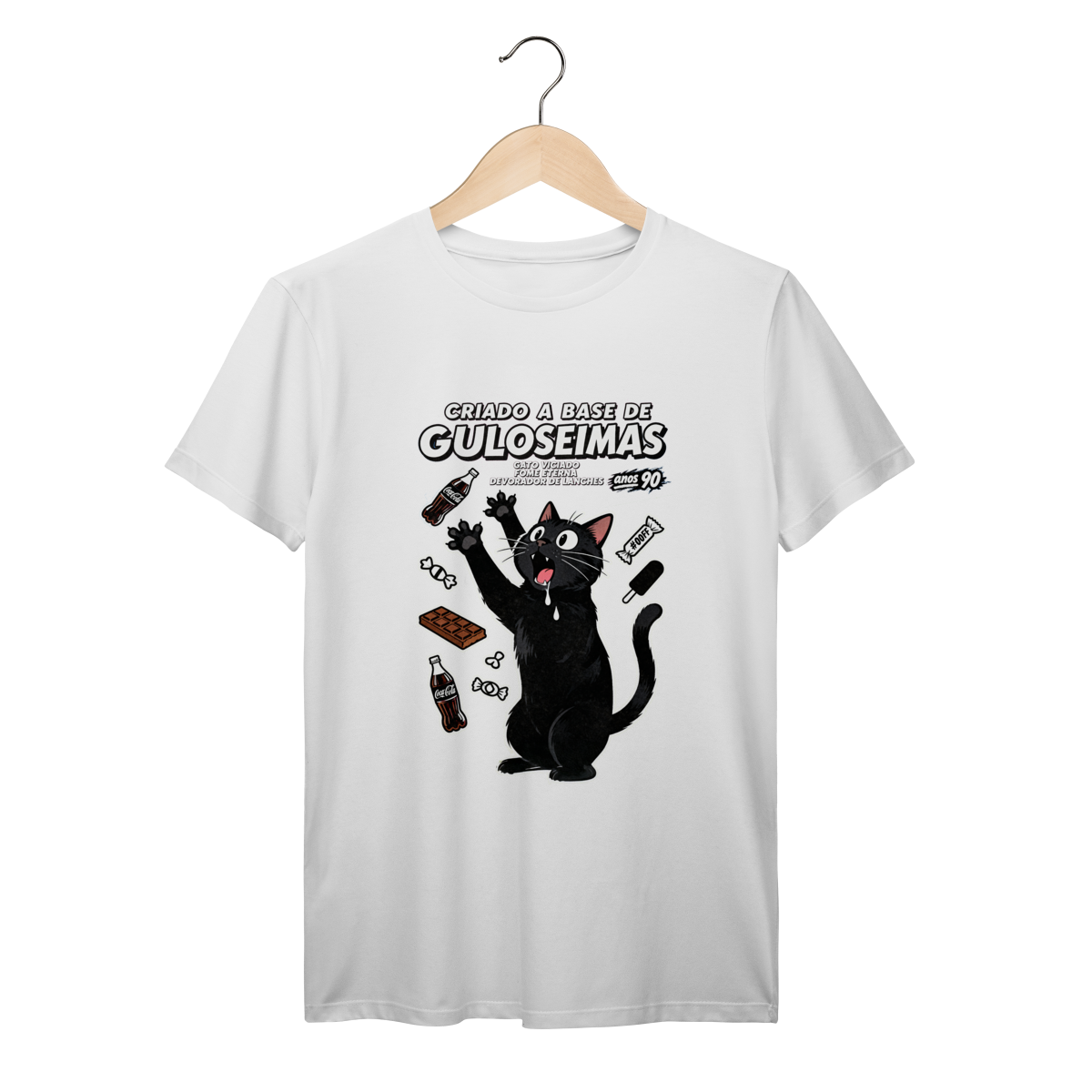 Criado a base de guloseimas e fome eterna insaciável. Camiseta exclusiva Dicavalli com nosso gato obsessivo em desespero cômico por snacks. Expressão de quem vê um salgadinho e perde totalmente o controle. Design horror-comédia retrô com estética de propaganda vintage anos 80/90 e vibe de vício alimentar hilário. Arte original que captura a relação tóxica mas deliciosa com guloseimas da infância. Ideal para nerds, geeks e devoradores compulsivos de lanches. Qualidade premium para quem foi criado literalmente a base de Fandangos, Bis e Guaraná. Fome eterna, humor eterno.