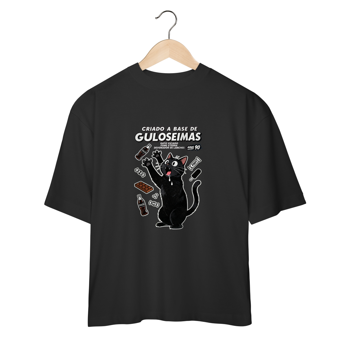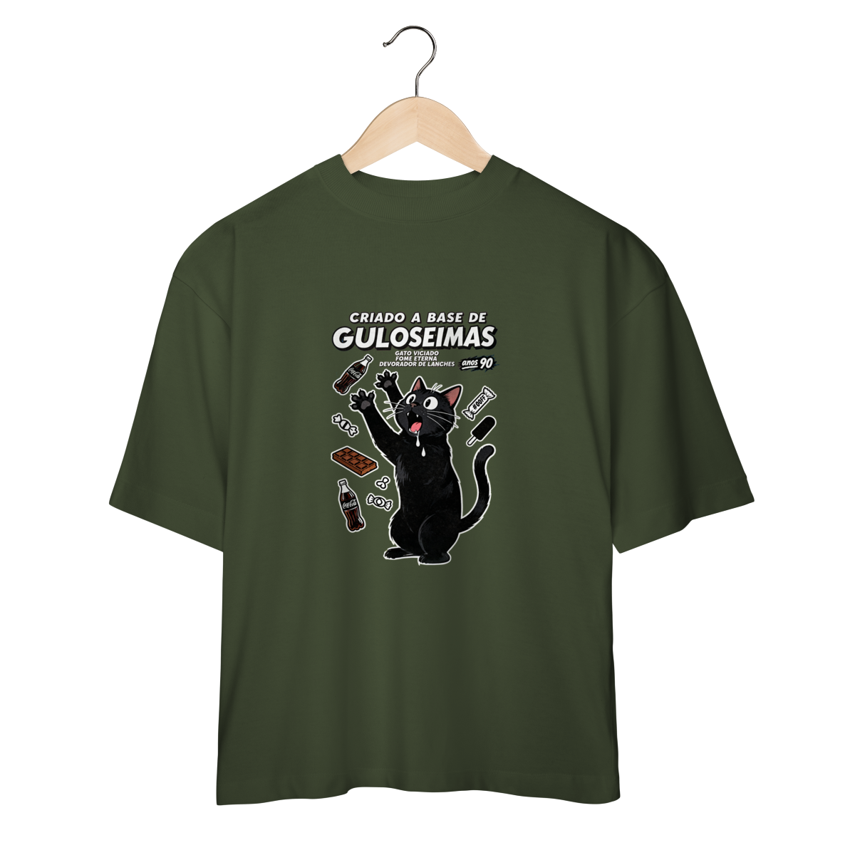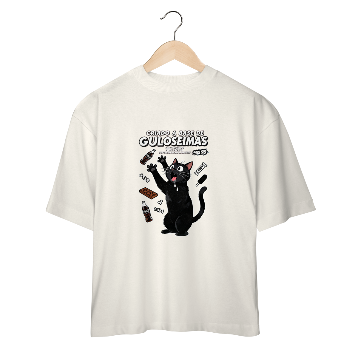 Criado a base de guloseimas e fome eterna insaciável. Camiseta exclusiva Dicavalli com nosso gato obsessivo em desespero cômico por snacks. Expressão de quem vê um salgadinho e perde totalmente o controle. Design horror-comédia retrô com estética de propaganda vintage anos 80/90 e vibe de vício alimentar hilário. Arte original que captura a relação tóxica mas deliciosa com guloseimas da infância. Ideal para nerds, geeks e devoradores compulsivos de lanches. Qualidade premium para quem foi criado literalmente a base de Fandangos, Bis e Guaraná. Fome eterna, humor eterno.