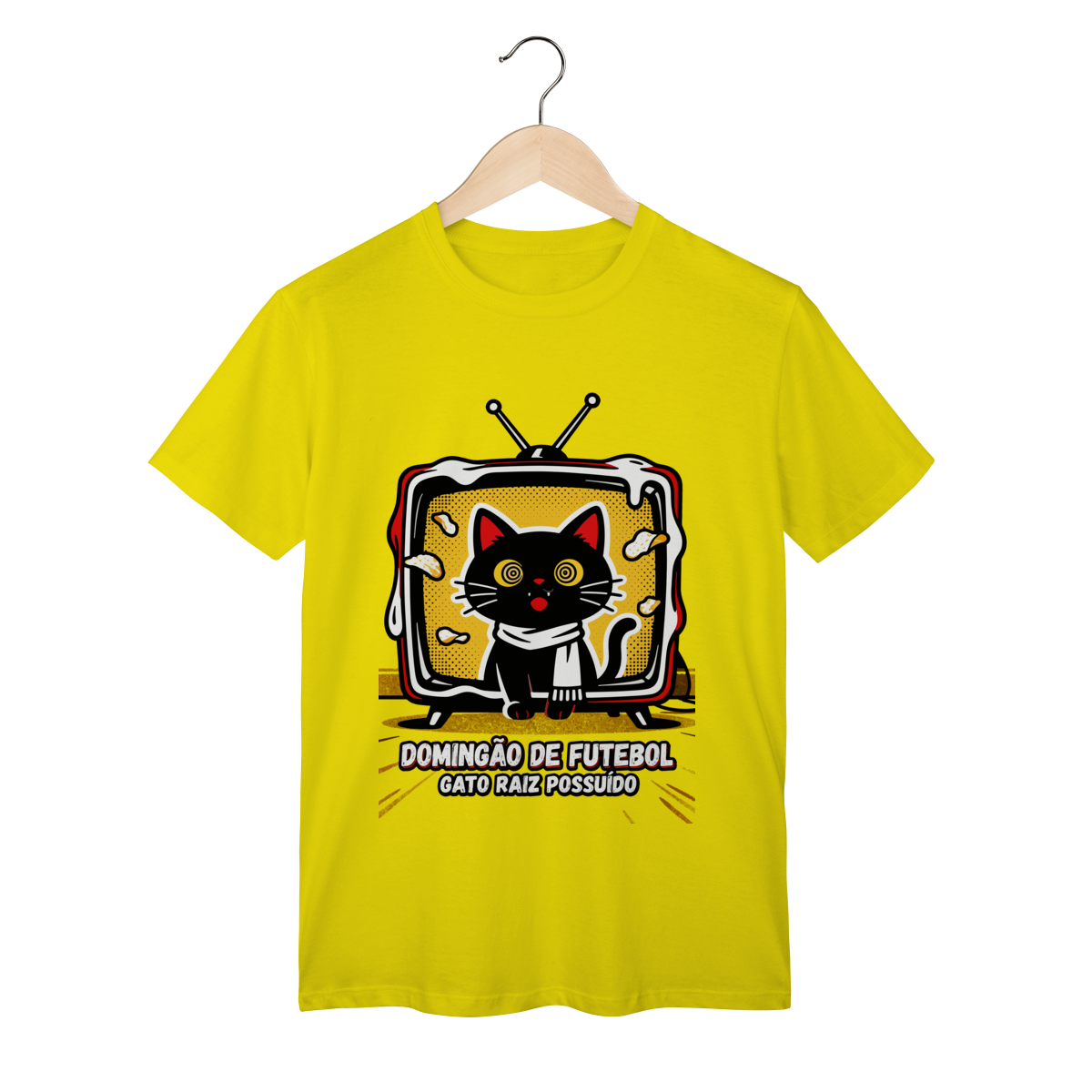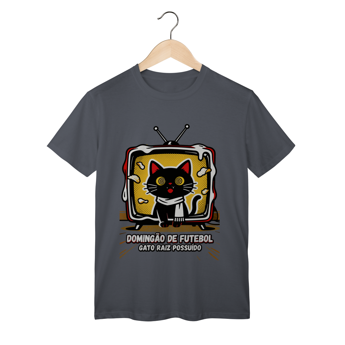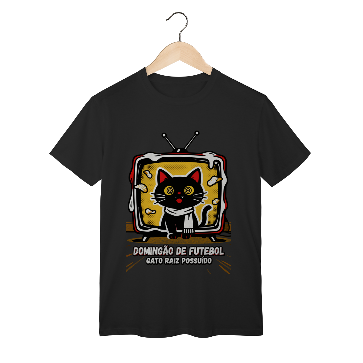 Domingão de futebol como antigamente: TV ligada, salgadinhos abertos e gato raiz possuído. Camiseta exclusiva Dicavalli com nosso fanático nostálgico em caos multitarefa máximo. Olhos girando em direções diferentes tentando assistir jogo e pegar snacks flutuantes simultaneamente. Design horror-comédia que captura a essência sagrada do domingo brasileiro anos 90. Arte original com TV derretendo e cachecol retrô em energia caótica vintage total. Ideal para nerds, geeks e guardiões da tradição domingueira. Qualidade premium para quem vive o futebol raiz com possessão nostálgica. Domingo eterno, caos sagrado.