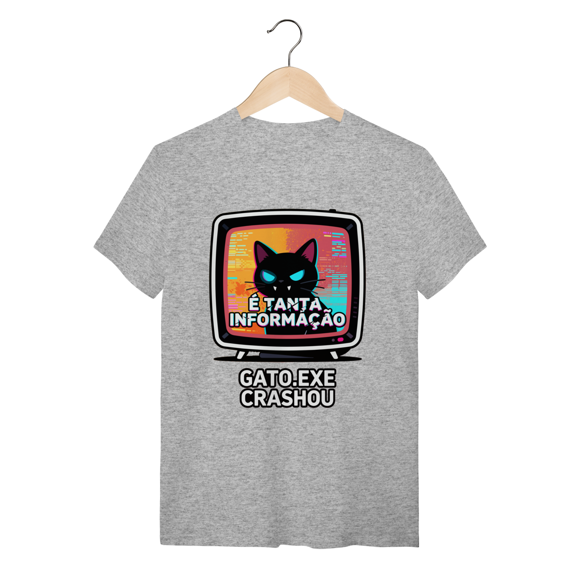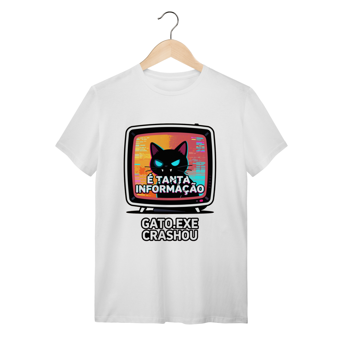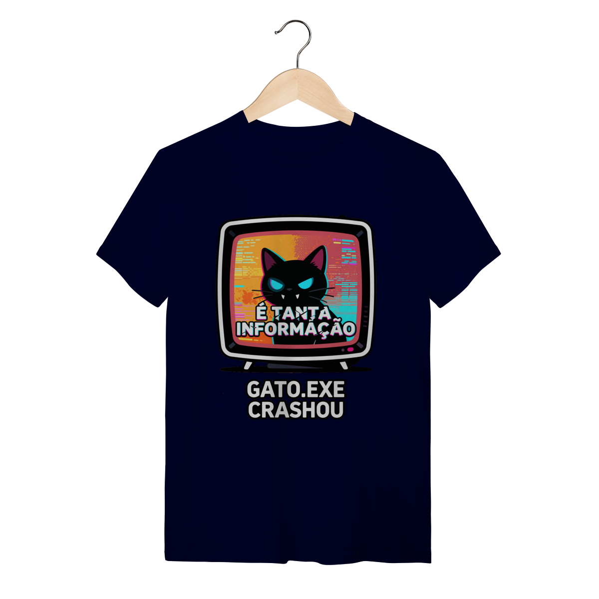 E tanta informação que o gato.exe simplesmente crashou. Camiseta exclusiva Dicavalli com nosso demônio digital possuído pelo inferno das redes sociais. Expressão de quem está preso entre a TV dos Anos 90 e o caos digital moderno. Olhos brilhando com estática vintage misturada à luz azul da tela. Design horror-comédia que captura a sobrecarga informacional da geração que cresceu analógica e enlouqueceu digital. Arte original para nerds, geeks e vítimas do excesso de informação. Qualidade premium para quem vive crashando entre nostalgia e modernidade. Sistema operacional em colapso permanente.