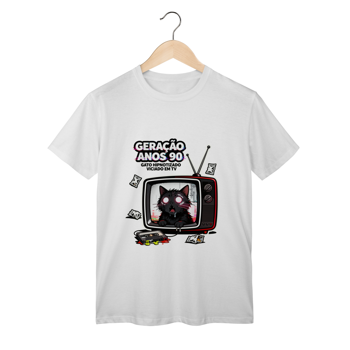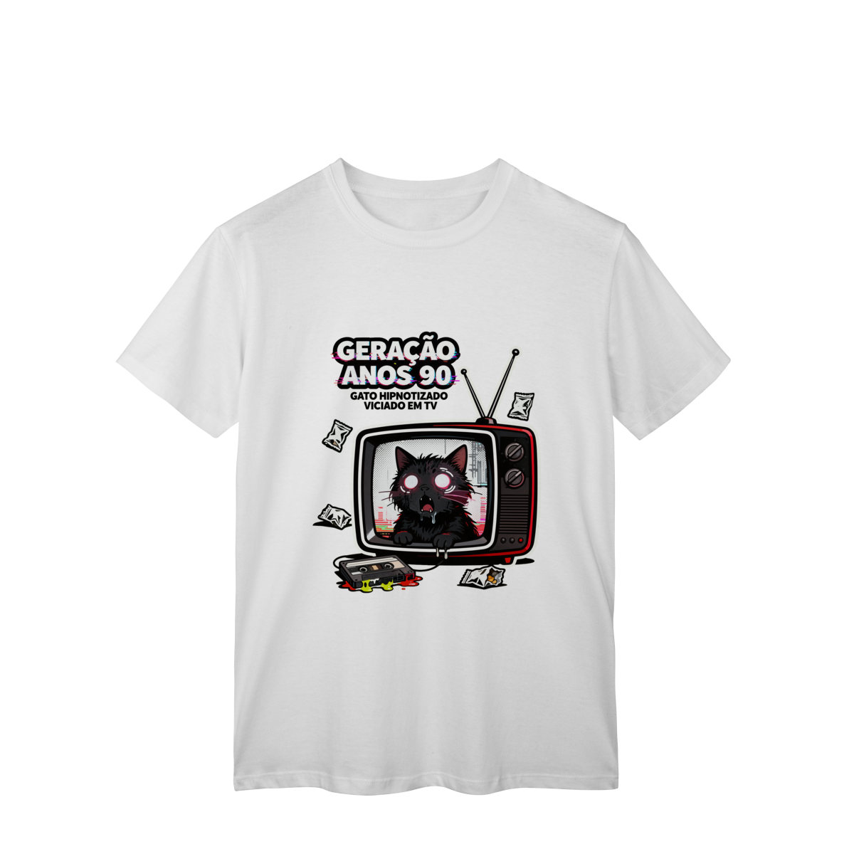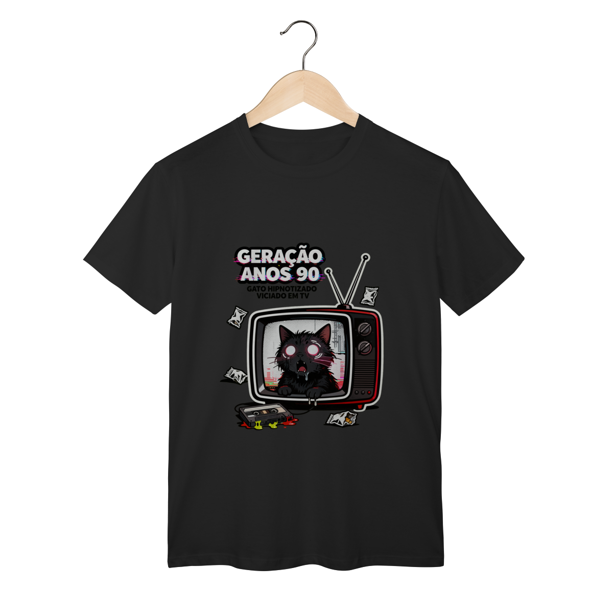 Geração Anos 90 viciada em TV e nostalgia hipnotizante. Camiseta exclusiva Dicavalli com nosso gato zumbi absorvido pela telinha há 48 horas direto. Expressão hipnotizada hilária que captura a essência de quem cresceu grudado na TV com Salgadinhos Elma Chips e Guaraná. Design horror-comédia retrô com estética VHS, cores vibrantes noventistas e vibe Memphis dark. Arte original para quem viveu a era de ouro da televisão brasileira. Ideal para nerds, geeks e millennials nostálgicos do controle remoto gigante. Qualidade premium para a geração TV Globinho e Pokémon dublado.