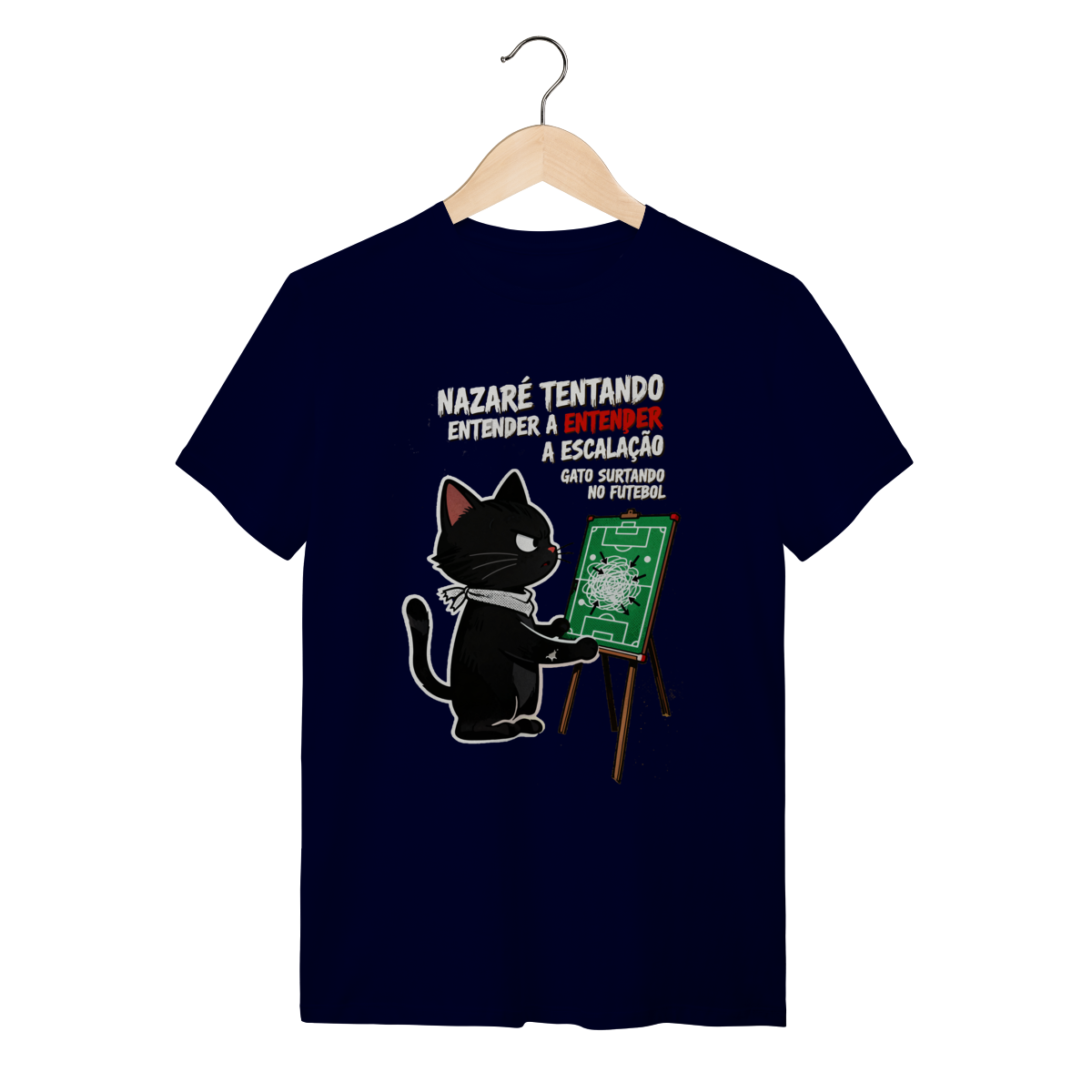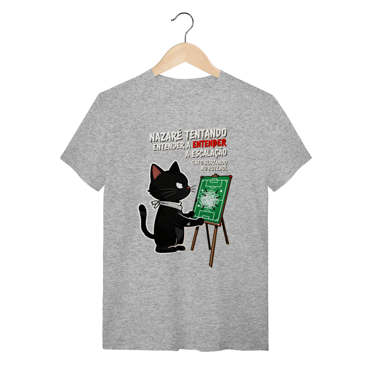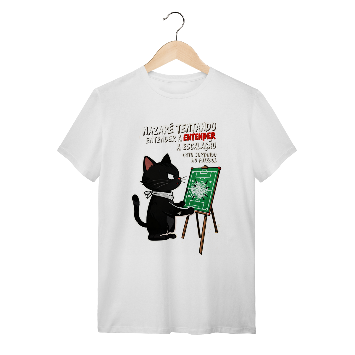 Nazaré tentando entender a escalação e surtando completamente. Camiseta exclusiva Dicavalli com nosso gato em colapso mental total diante do quadro tático. Expressão confusa e raivosa simultânea, olho tremendo, tentando decifrar setas que não levam a lugar nenhum. Design horror-comédia que captura o momento exato quando o técnico escala errado e você perde a sanidade. Arte original para torcedores que entendem que futebol é tática mas também é loucura. Ideal para nerds, geeks e analistas futebolísticos amadores enlouquecidos. Qualidade premium para quem surta com escalação todo jogo.