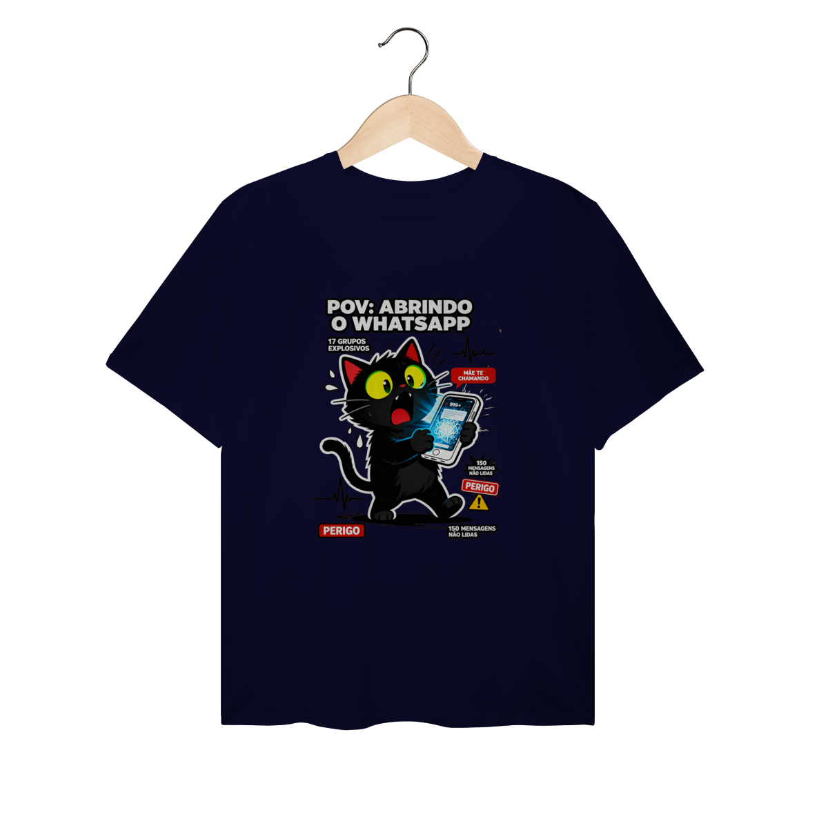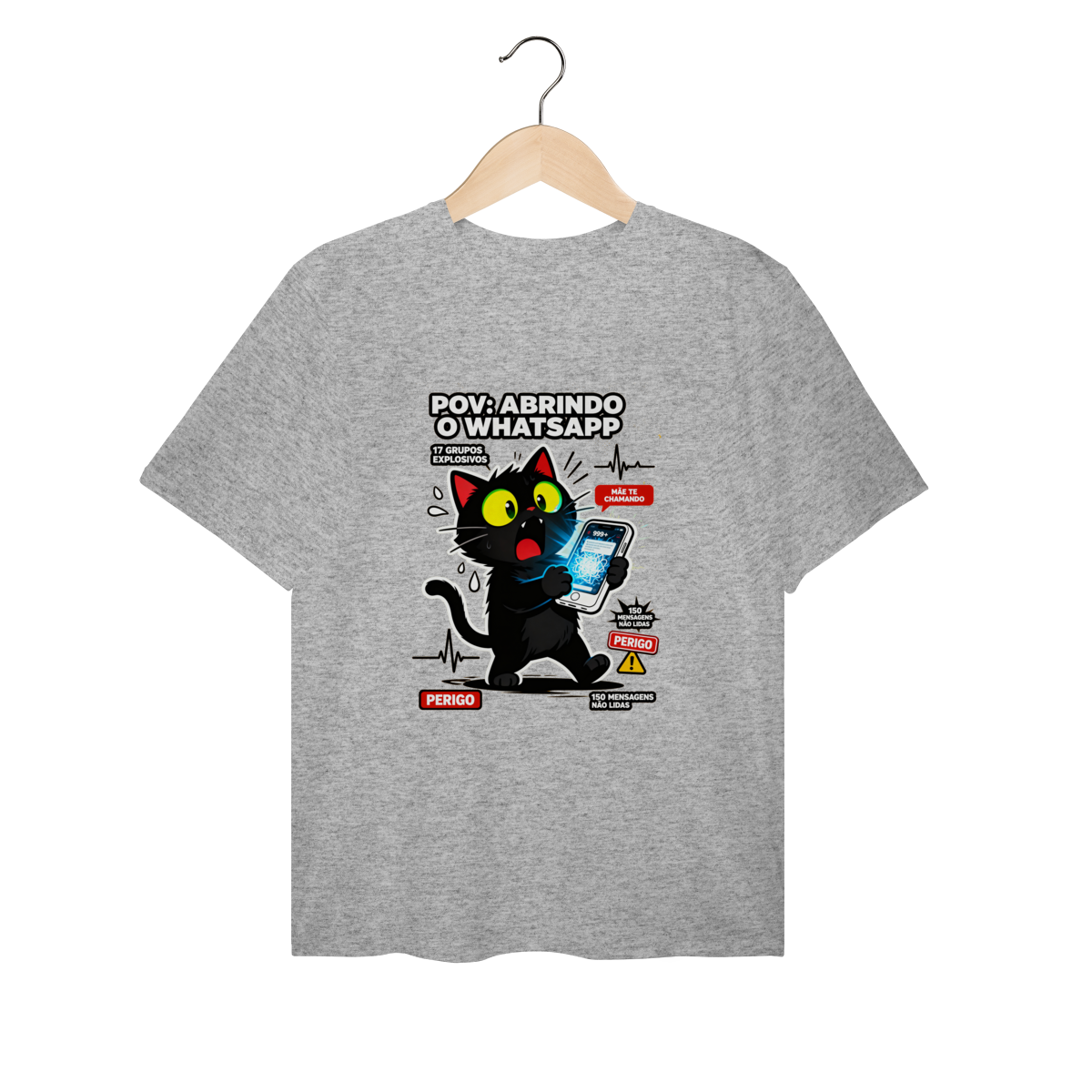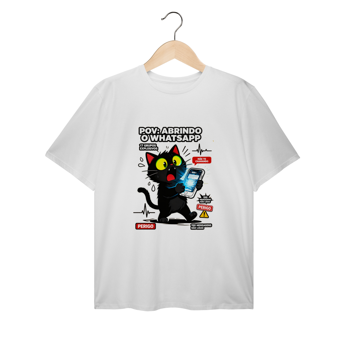 POV: Abrindo o WhatsApp e vendo 17 grupos explosivos e mãe te chamando. Camiseta exclusiva Dicavalli com nosso gato absolutamente aterrorizado segurando celular como objeto amaldiçoado. Olhos enormes horrorizados, pupilas minúsculas, boca em grito silencioso, pelos totalmente arrepiados. Tela do phone mostrando brilho ominoso e 999+ notificações de caos. Design horror-comédia Gen Z que captura o terror de abrir app de mensagens. Arte original com elementos de pânico: gotas de suor, batimentos cardíacos loucos, alerta PERIGO. Ideal para nerds, geeks e zoomers com ansiedade digital crônica. Qualidade premium para quem teme notificações. Terror relatable diário.