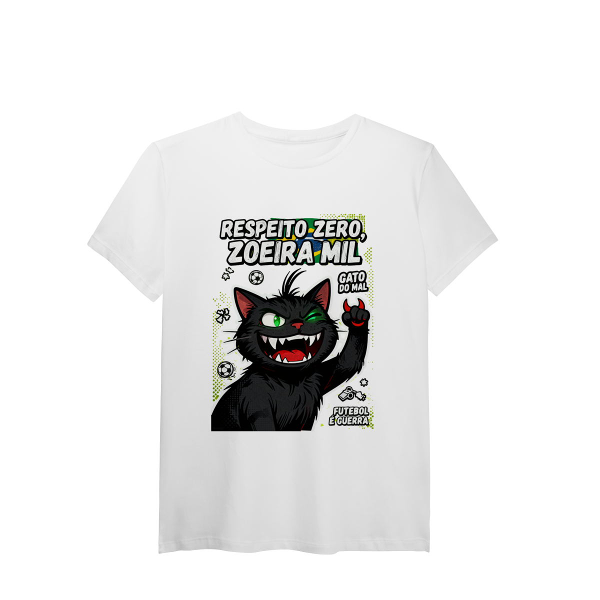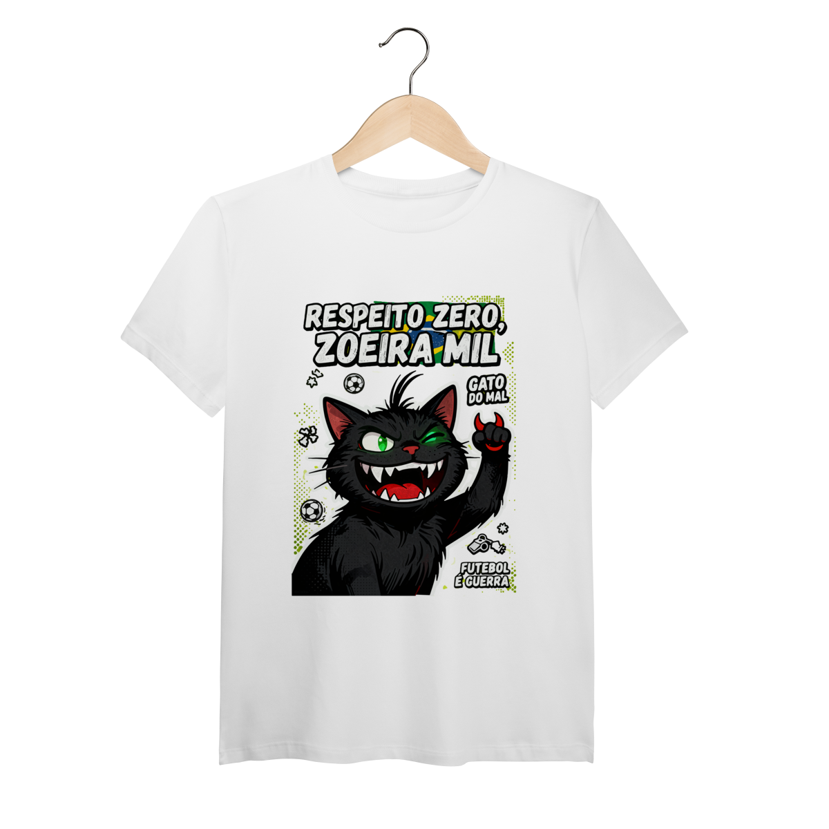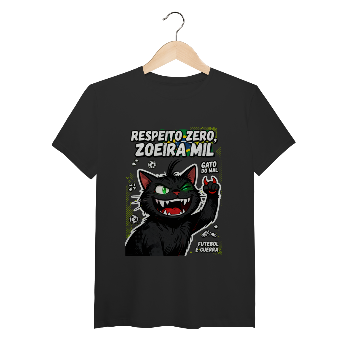 Respeito zero, zoeira mil e futebol é guerra. Camiseta exclusiva Dicavalli com nosso gato do mal em máxima energia caótica. Expressão maligna hilária perfeita para zoar rivais e curtir o caos do futebol brasileiro. Design horror-comédia com elementos dark humor e cores da bandeira usadas de forma sinistra. Arte original que captura a essência da zoeira sem limites e rivalidade engraçada. Ideal para torcedores que levam a zoeira a sério e o respeito a zero. Qualidade premium para nerds, geeks e agentes do caos futebolístico. Vista a maldade com humor brasileiro puro.