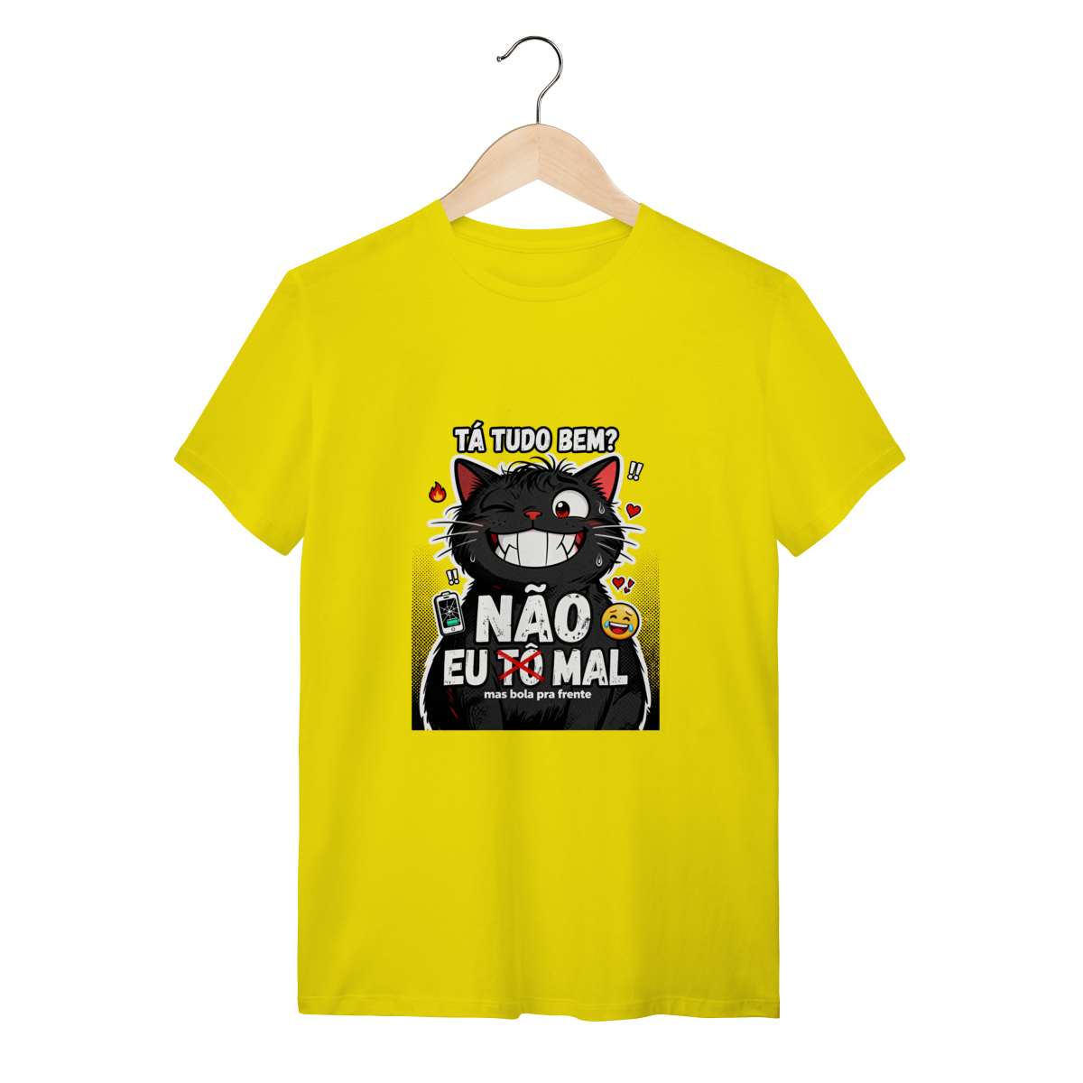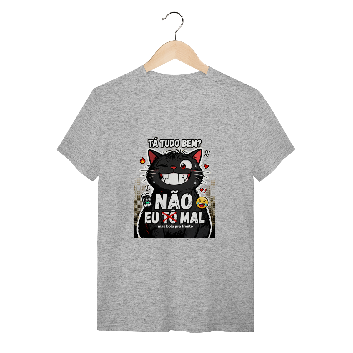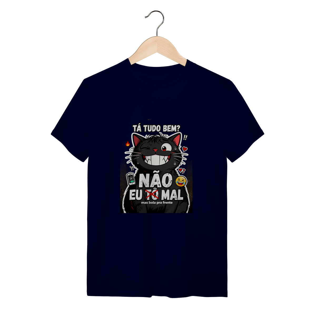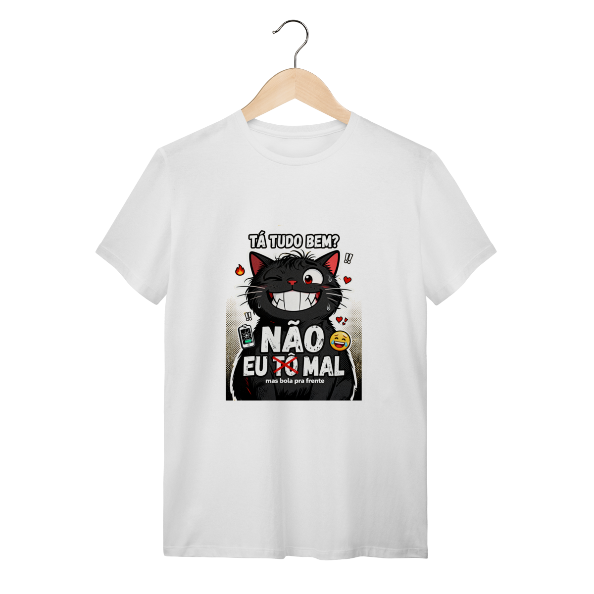 Tá tudo bem? NÃO. Camiseta exclusiva Dicavalli com nosso gato extremamente mal mas forçando sorriso. Olhos estressados com olheiras visíveis, sorriso gigante falso mostrando presas desconfortáveis, olho tremendo. Fur bagunçado, gotas de suor, energia de "eu tô bem" mentindo. Design humor negro Gen Z que captura a essência da ansiedade brasileira moderna. Arte original com elementos caóticos: fogo, corações quebrados, bateria fraca, emoji chorando sorrindo. Mas bola pra frente. Ideal para nerds, geeks e zoomers vivendo no limite mas fingindo normalidade. Qualidade premium para saúde mental questionável com humor relatable.