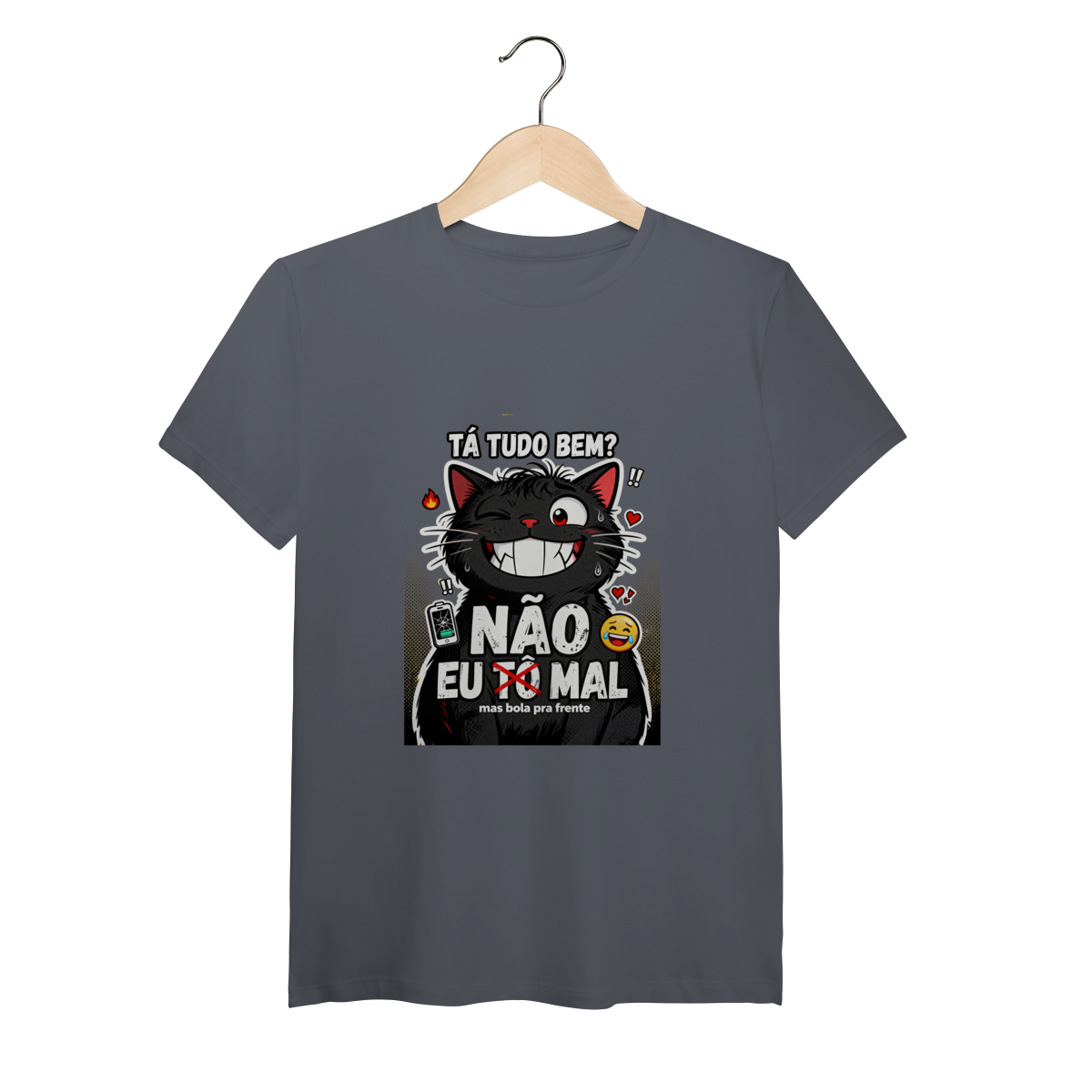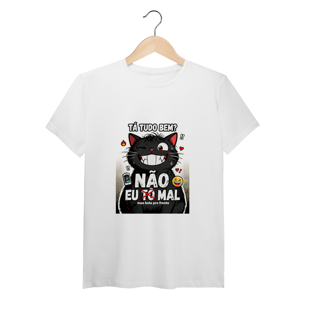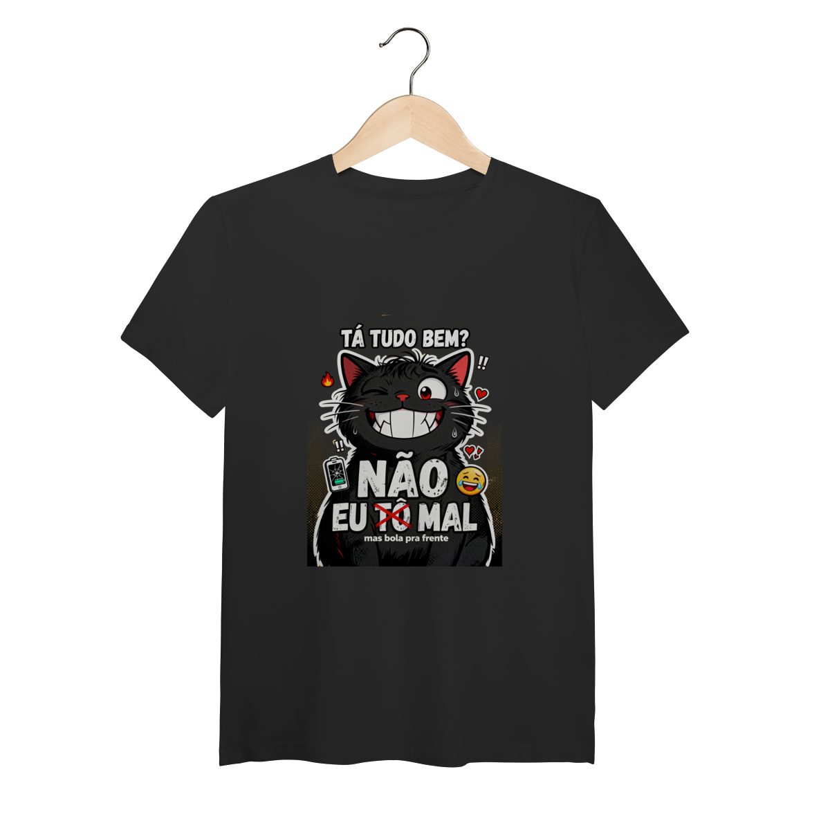 Tá tudo bem? NÃO. Camiseta exclusiva Dicavalli com nosso gato extremamente mal mas forçando sorriso. Olhos estressados com olheiras visíveis, sorriso gigante falso mostrando presas desconfortáveis, olho tremendo. Fur bagunçado, gotas de suor, energia de "eu tô bem" mentindo. Design humor negro Gen Z que captura a essência da ansiedade brasileira moderna. Arte original com elementos caóticos: fogo, corações quebrados, bateria fraca, emoji chorando sorrindo. Mas bola pra frente. Ideal para nerds, geeks e zoomers vivendo no limite mas fingindo normalidade. Qualidade premium para saúde mental questionável com humor relatable.