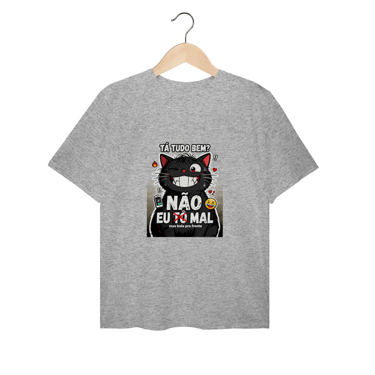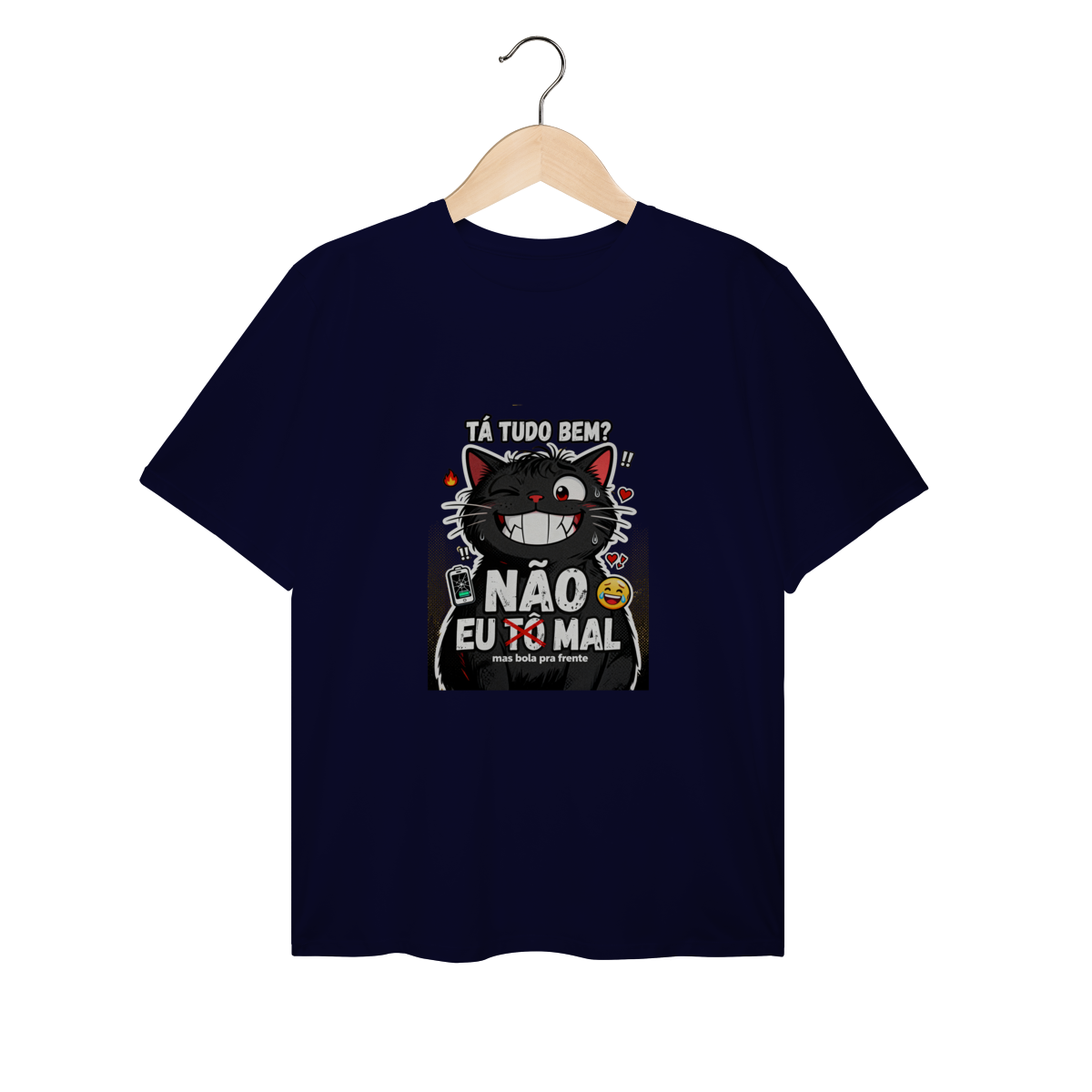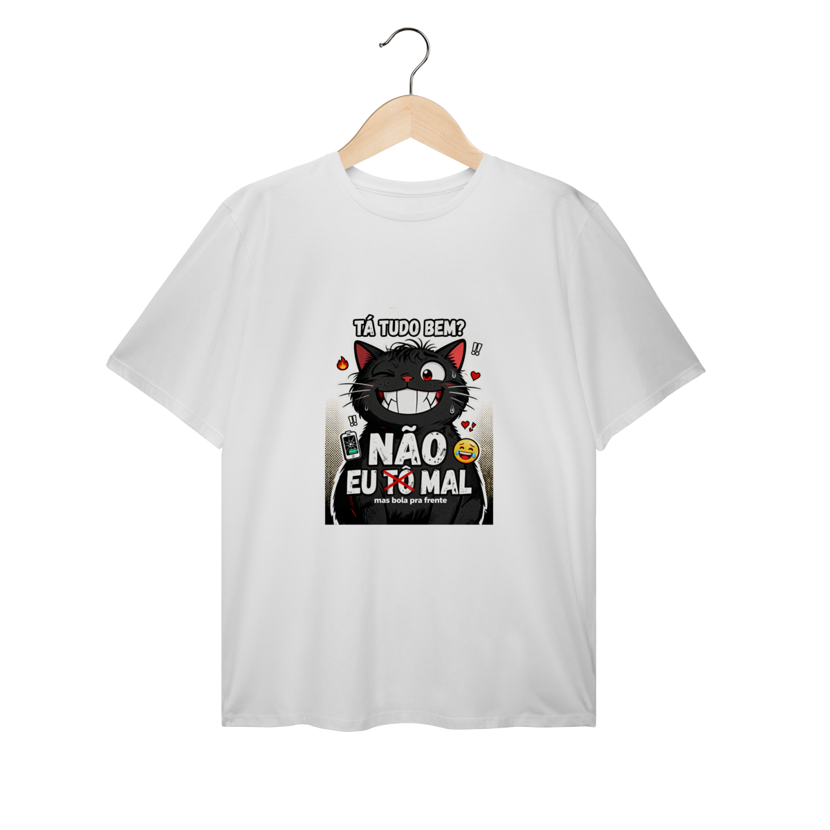 Tá tudo bem? NÃO. Camiseta exclusiva Dicavalli com nosso gato extremamente mal mas forçando sorriso. Olhos estressados com olheiras visíveis, sorriso gigante falso mostrando presas desconfortáveis, olho tremendo. Fur bagunçado, gotas de suor, energia de "eu tô bem" mentindo. Design humor negro Gen Z que captura a essência da ansiedade brasileira moderna. Arte original com elementos caóticos: fogo, corações quebrados, bateria fraca, emoji chorando sorrindo. Mas bola pra frente. Ideal para nerds, geeks e zoomers vivendo no limite mas fingindo normalidade. Qualidade premium para saúde mental questionável com humor relatable.