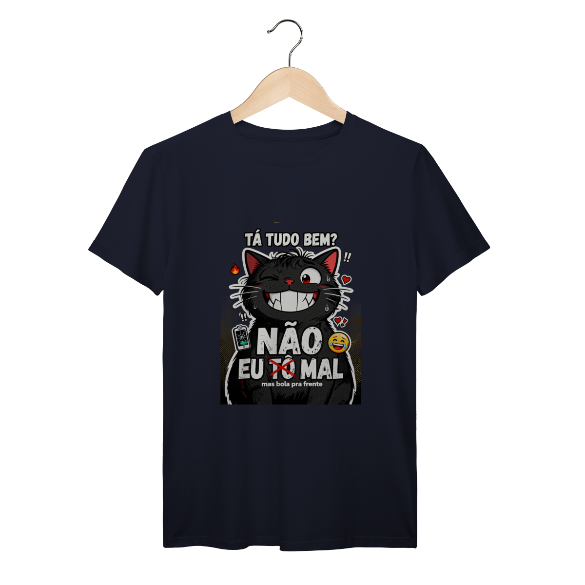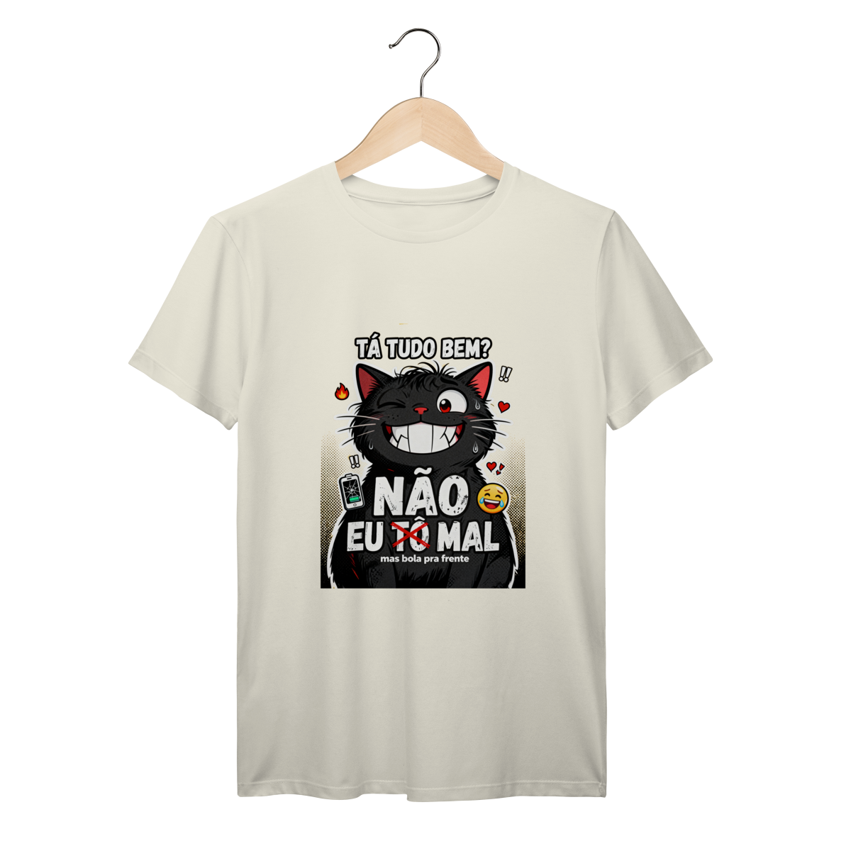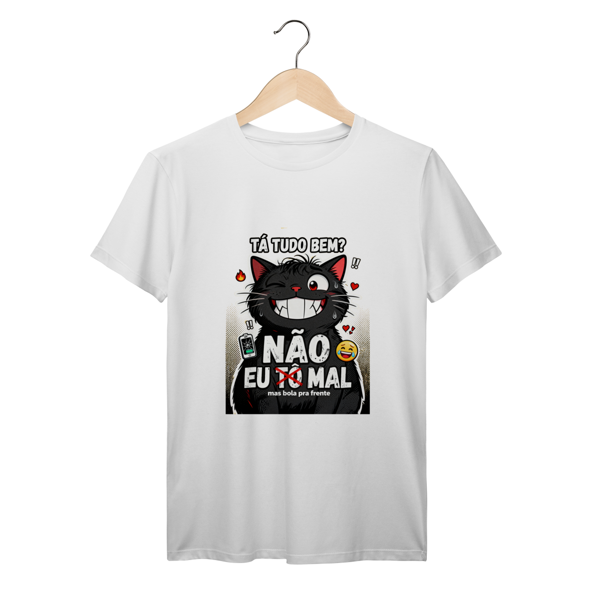 Tá tudo bem? NÃO. Camiseta exclusiva Dicavalli com nosso gato extremamente mal mas forçando sorriso. Olhos estressados com olheiras visíveis, sorriso gigante falso mostrando presas desconfortáveis, olho tremendo. Fur bagunçado, gotas de suor, energia de "eu tô bem" mentindo. Design humor negro Gen Z que captura a essência da ansiedade brasileira moderna. Arte original com elementos caóticos: fogo, corações quebrados, bateria fraca, emoji chorando sorrindo. Mas bola pra frente. Ideal para nerds, geeks e zoomers vivendo no limite mas fingindo normalidade. Qualidade premium para saúde mental questionável com humor relatable.